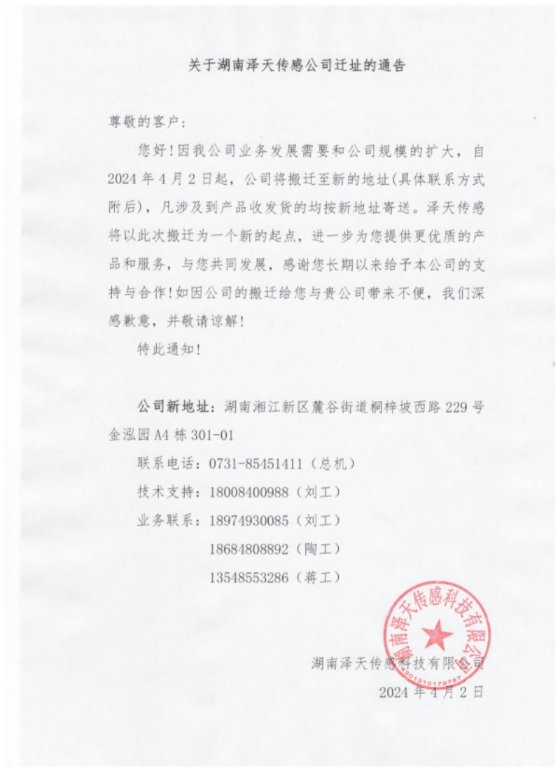 您好!因我公司業(yè)務(wù)發(fā)展需要和公司規(guī)模的擴(kuò)大,自2024年4月2日起,公司將搬遷至新的地址(具體聯(lián)系方式附后),凡涉及到產(chǎn)品收發(fā)貨的均按新地址寄送。澤天傳感將以此次搬遷為一個(gè)新的起點(diǎn),進(jìn)一步為您提供更優(yōu)質(zhì)的產(chǎn)品和服務(wù),與您共同發(fā)展,感謝您長(zhǎng)期以來給予本公司的支持與合作!如因公司的搬遷給您與貴公司帶來不便,我們深感歉意,并敬請(qǐng)諒解!